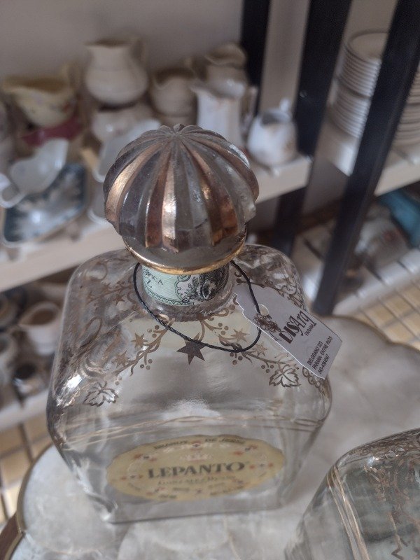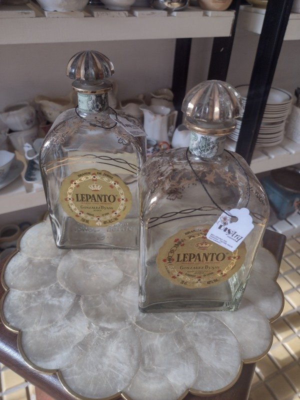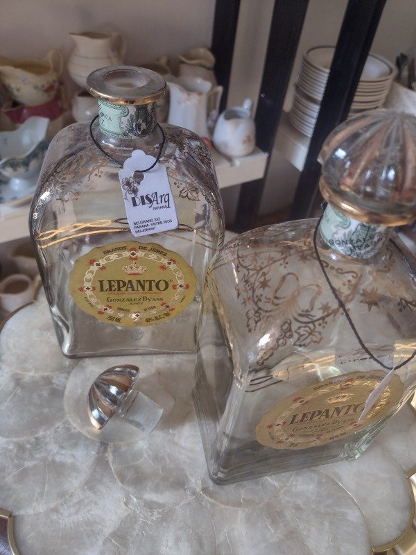Para decorar tu bar o rellenar con licores caseros. Antiguas botellas de brandy "Lepanto". Decoradas.