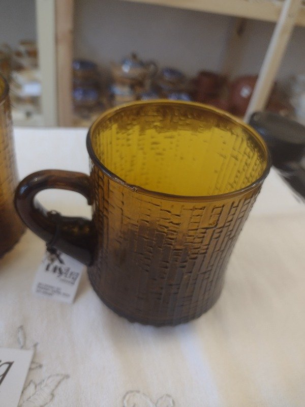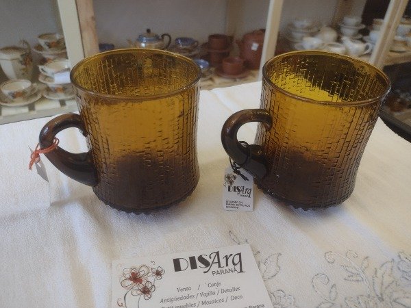 🌿 Para quienes gustan de los objetos vintage, estos vasos taza lo tienen todo. Color caramelo en vidrio con burbujas y patitas. Un primor.... Años 70. Para te caliente o frío o también una sangría. ❤️
