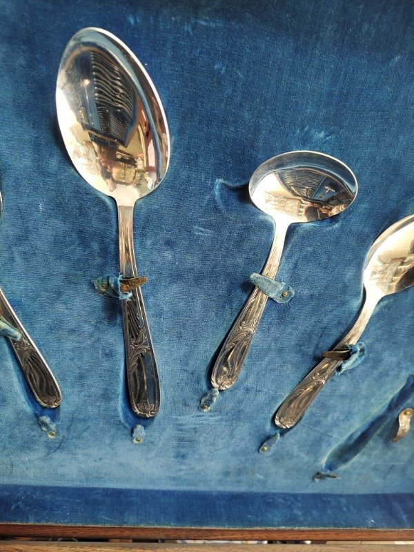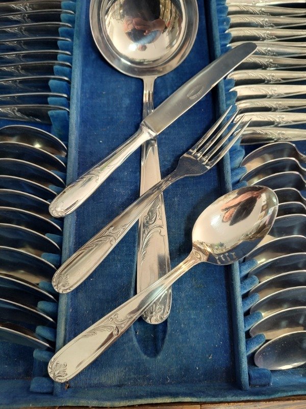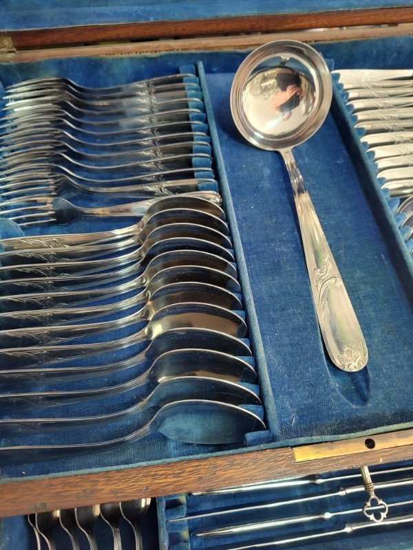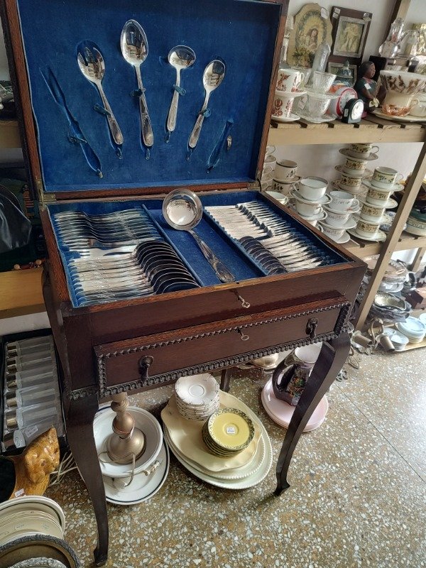 Bellísimo cubiertero antiguo de nogal con un juego súper completo de acero. Las 101 piezas están en buen estado. Casi sin uso.