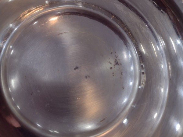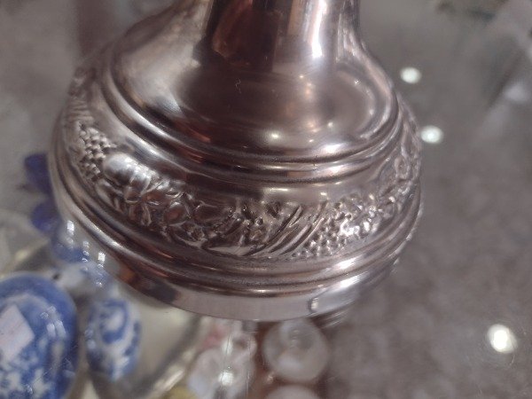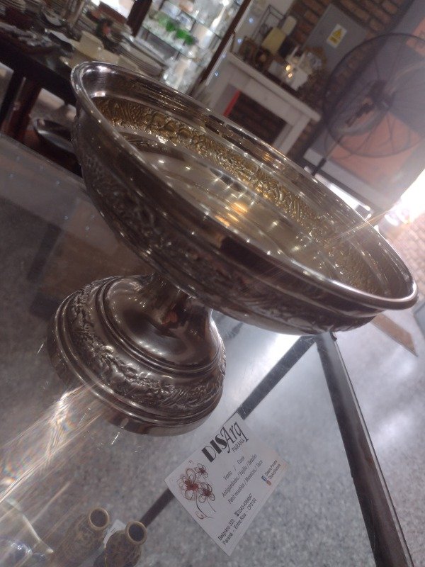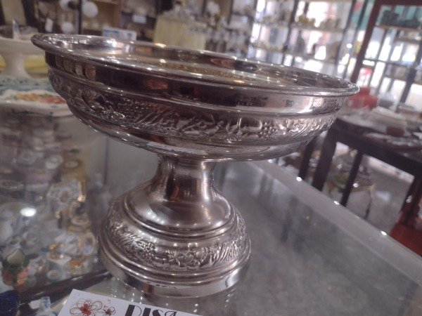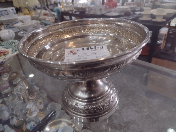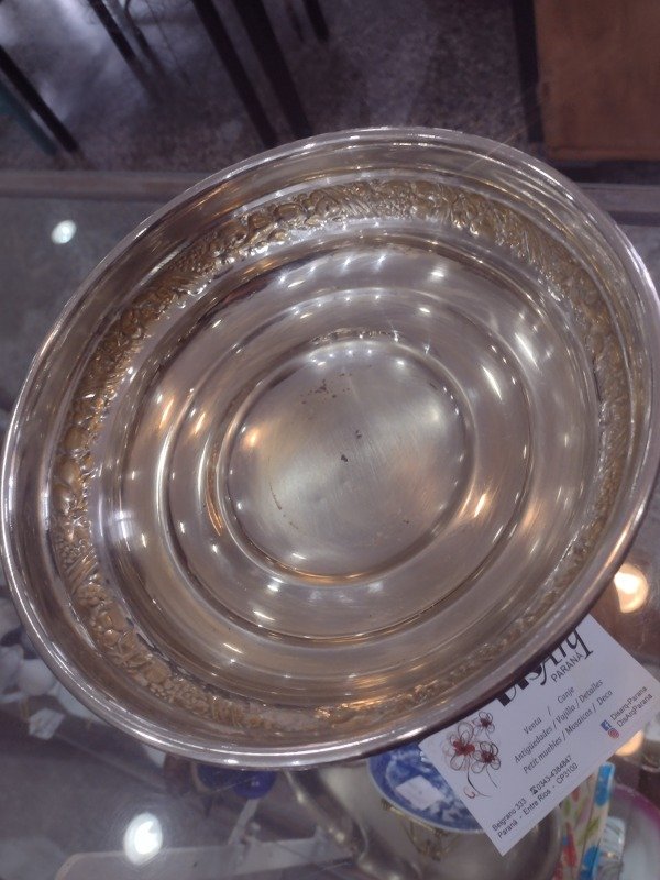 🍒🍓🍇Hermoso centro de mesa o frutera en metal blanco. Labrado. 21 de diámetro. Presenta mínimo detalle, en foto. Muy buen estado. 🍓🍒🍇