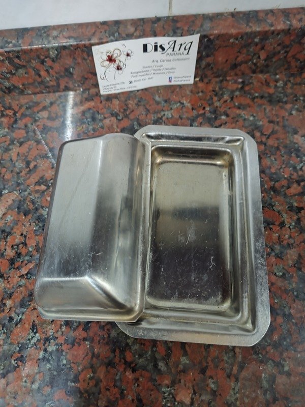 Mantequera de acero inoxidable con tapa. 16x10cm. Presenta detalles de uso.