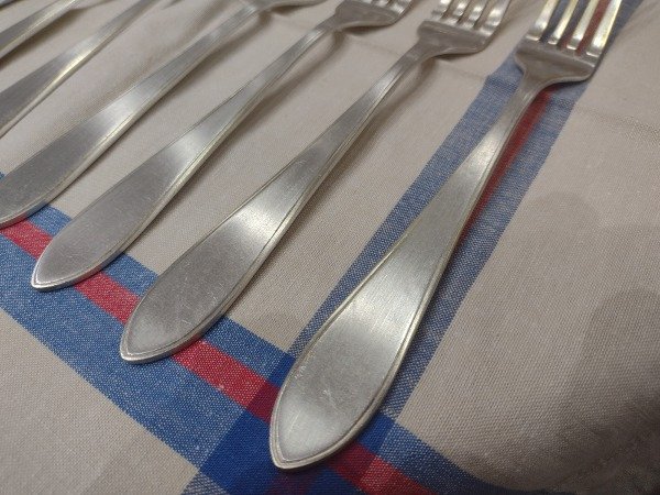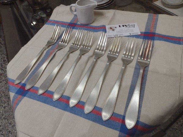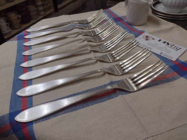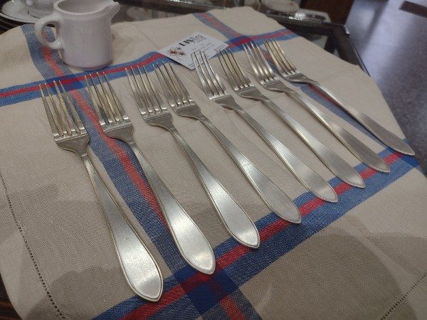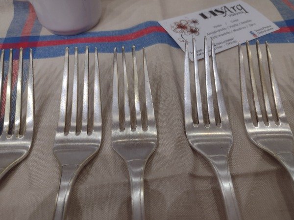 Muy buenos tenedores antiguos de alpaca con baño de plata. Muy firmes y de generoso tamaño. Presentan desgaste en el baño que no impide su uso. Juego x 8