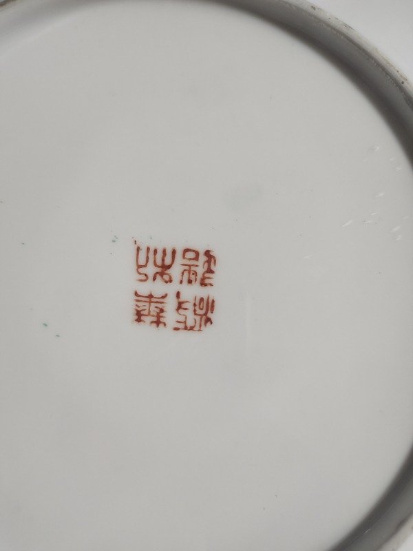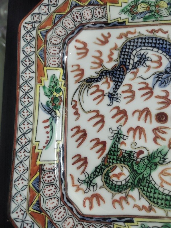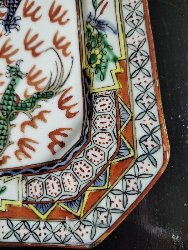 Hermoso plato cuadrado, tipo bandeja, en porcelana cantonesa. 21x21cm