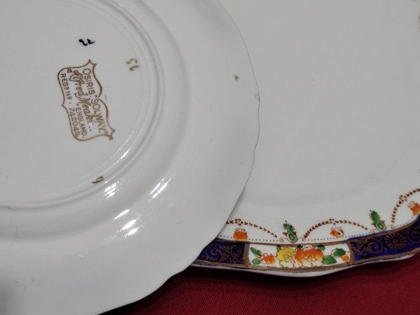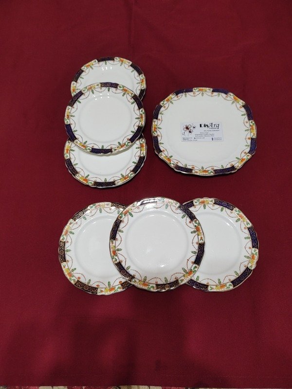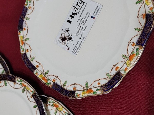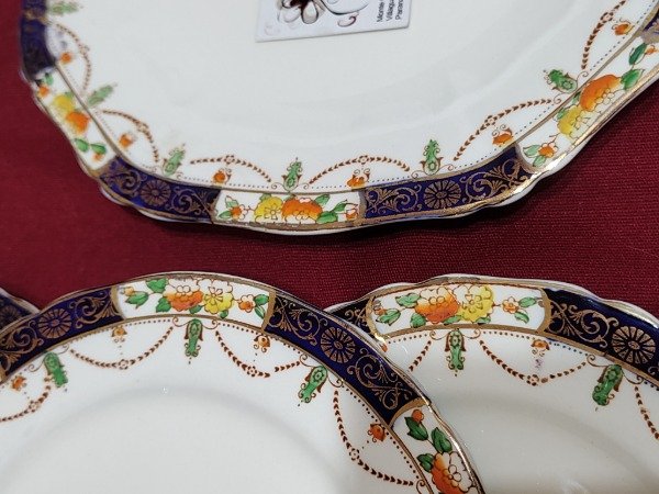 Toda la pompa de la loza inglesa en este juego de postre. Azul cobalto, dorado, filigranas, guardas...