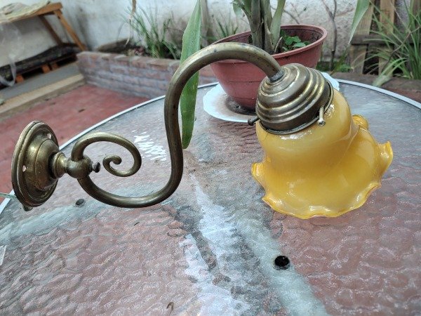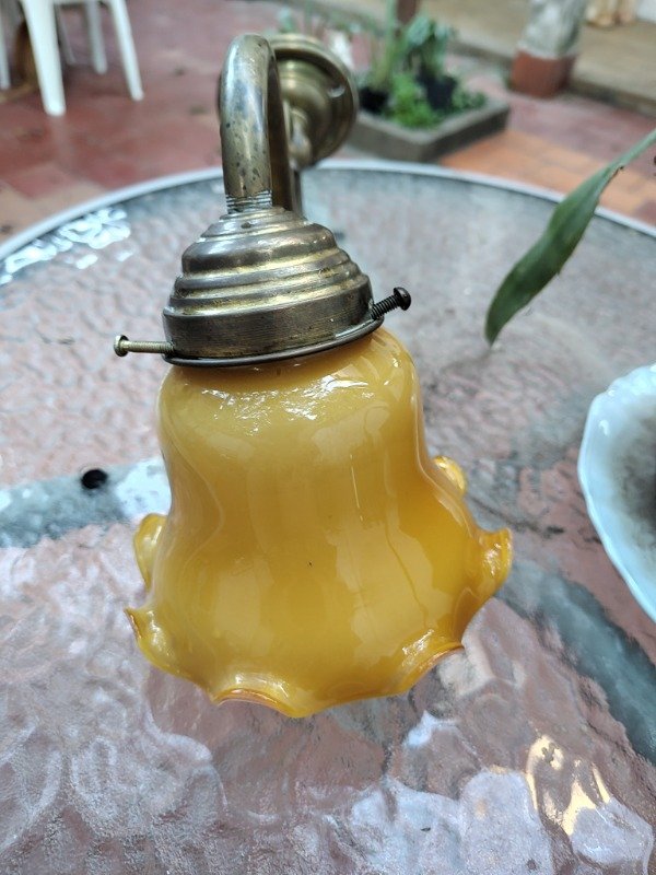 Aplique de bronce con tulipanes de opalina. 35cm de largo. Cableado listo para instalar.