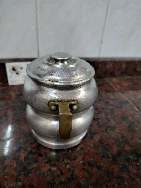 Antigua azucarera en aluminio. Con detalles de uso. Con asas de bronce.