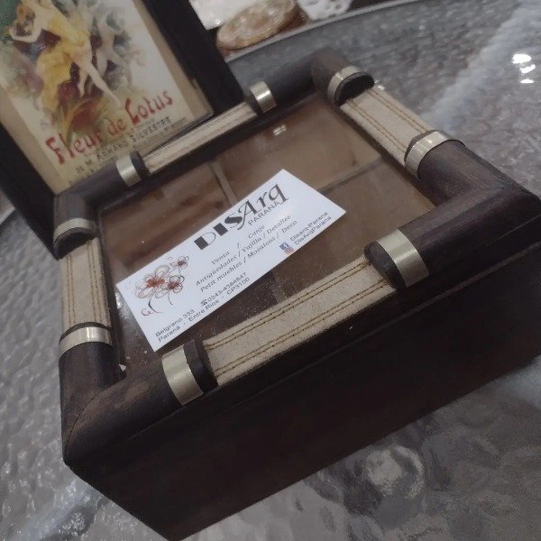 Caja de té en madera con detalles de cuero. 4 divisiones. Excelente estado.