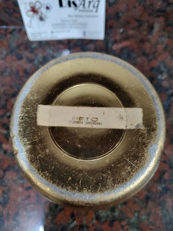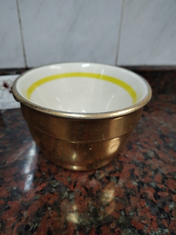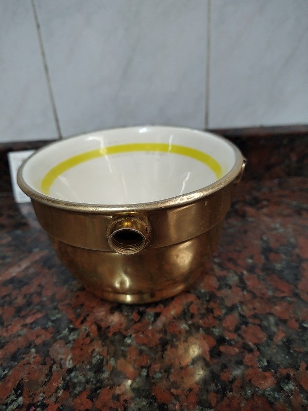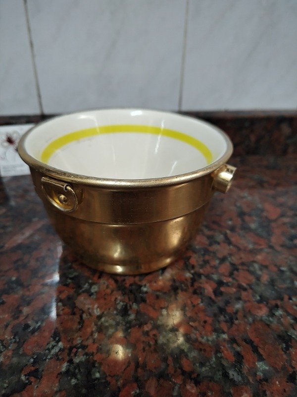 Antiguo plato hondo o cuenco de aluminio y loza donde se carga agua caliente para mantener la comida a temperatura. Muy buen estado. Falta tapón. 12,5cm de diámetro y 8 cm de alto