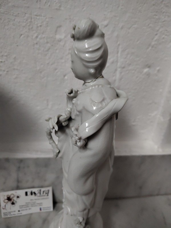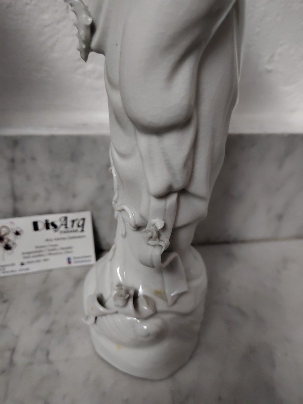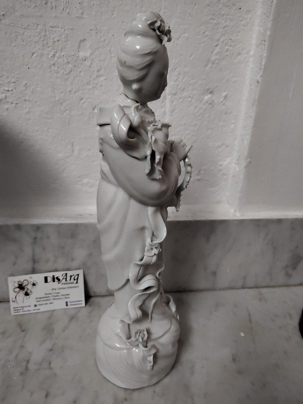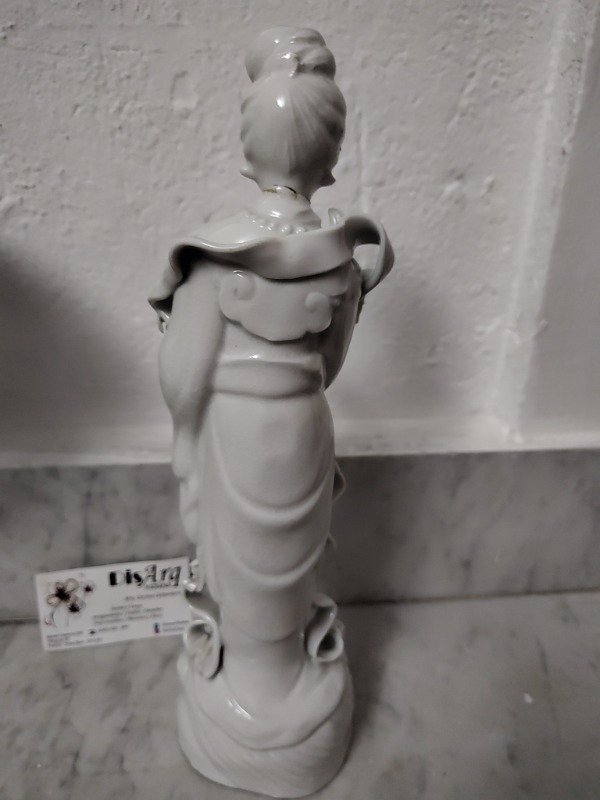 Bella pieza de porcelana blanca. Figura de dama japonesa con delicados detalles en su vestimenta. 32cm de altura. Presenta su cabeza reparada.