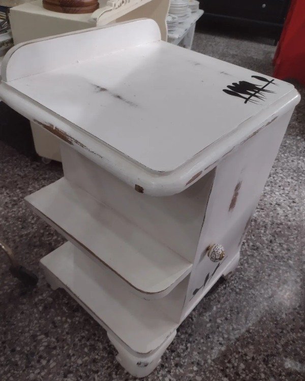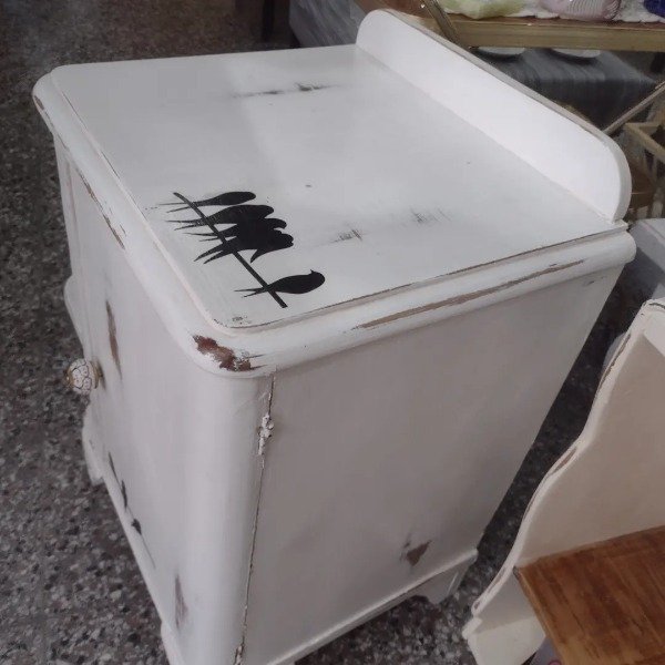 Antigua mesa de luz patinada en blanco con aplique de pajaritos. Muy buen estado. DisArqParana 🌿🌼